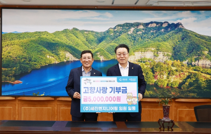 ▲ ㈜세진엔지니어링 박찬갑 대표(사진 좌측)가 임원을 대표하여 고향사랑 기부금을 전달하고 있다. |