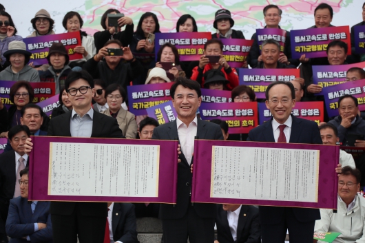 국민의힘 추경호 원내대표는 “여기 계신 국민의힘 강원·충청 국회의원님들을 비롯해 김진태 강원특별자치도지사, 시장·군수님은 제천~삼척 고속도로 예타 통과를 위해 이 자리에 계신 것”이라며, “함께 힘을 모으면 꿈은 반드시 실현될 것”이라 강조했다.