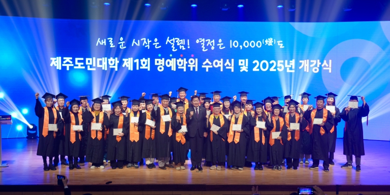 제주특별자치도는 7일 설문대여성문화센터에서 ‘제주도민대학 제1회 명예학위 수여식 및 2025년 개강식’을 개최했다.