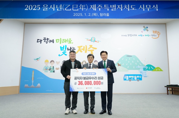오영훈 지사와 도 공무원노동조합 오태권 위원장은 직원들의 모금으로 마련된 봉급우수리 성금 3,608만 원을 2일 오전 도청 탐라홀에서 열린 ‘’25년 제주도청 시무식’에서 제주 사회복지공동모금회에 전달했다.