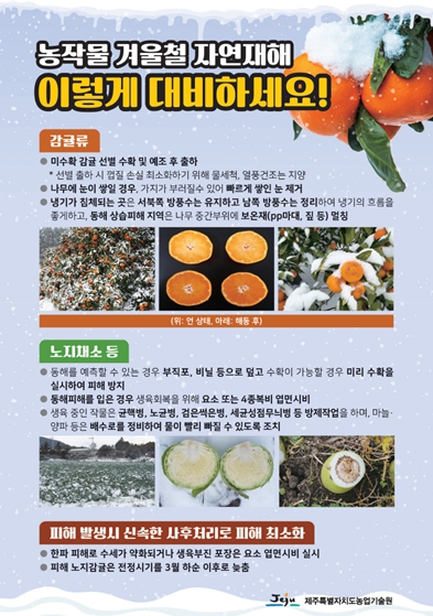 농업재해 대비 겨울철 농작물 관리요령은 농업기술원 누리집, 제주영농지원시스템 및 스마트폰 제주영농정보 앱을 통해 확인할 수 있으며, 가까운 농업기술센터에서 안내받을 수 있다.