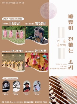 이번 가을음악회 '바람이 전하는 소리'는 아름다운 국악의 선율과 가을의 정취를 느낄 수 있는 무대로, 도민들에게 양질의 공연문화콘텐츠 향유 기회를 제공하고자 기획됐다.