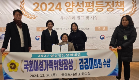[뉴스서울] 제주특별자치도의회 행정자치위원회 김경미 의원(제주시 삼양동․봉개동, 더불어민주당)이 26일 국회도서관 소회의실에서 개최된‘2024 양성평등정책대상’시상식에서 영예의 ‘국회 여성가족위원장상’을 수상했다.