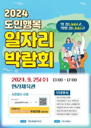 [뉴스서울] 제주특별자치도는 오는 25일 오후 1시부터 5시까지 제주 한라체육관에서 ‘일 잡(Job)고, 희망 잡(Job)고’라는 슬로건 아래'2024 도민행복 일자리박람회'를 개최한다.
