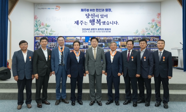 제주특별자치도는 28일 오전 제주도청 탐라홀에서 2024년 상반기 공직자 퇴임식 및 정부포상 수여식을 개최했다.