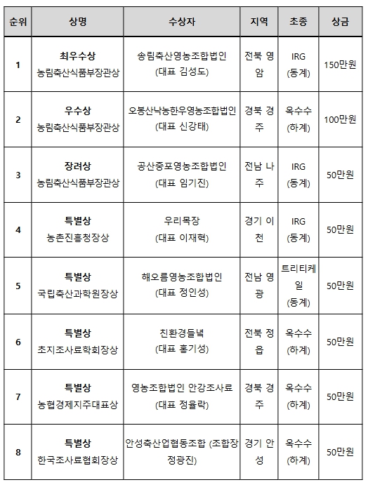 올해 최우수상은 전남 영암의 송림축산영농조합법인(대표 김성도)이 수상했으며, 우수상은 경북 경주의 오봉산낙농한우영농조합법인(대표 신강태), 장려상은 전남 나주의 공산중포영농조합법인(대표 임기진), 특별상은 경기 이천의 우리목장(대표 이재혁), 전남 영광의 해오름영농조합법인(대표 정인성), 전북 정읍의 친환경들녘(대표 홍기성), 경북 경주의 영농조합법인 안강조사료(대표 정율락), 경기 안성의 안성축산업협동조합(조합장 정광진)이 각각 수상했다.