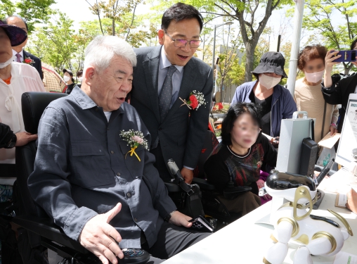 ▲ 체험부스에서 구민들과 함께 스마트 홈케어 체험을 하는 조성명 강남구청 |