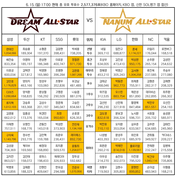 | ▲ 2025 신한 SOL뱅크 KBO 올스타 ‘베스트12’ 팬 투표 2차 중간 집계 결과 |