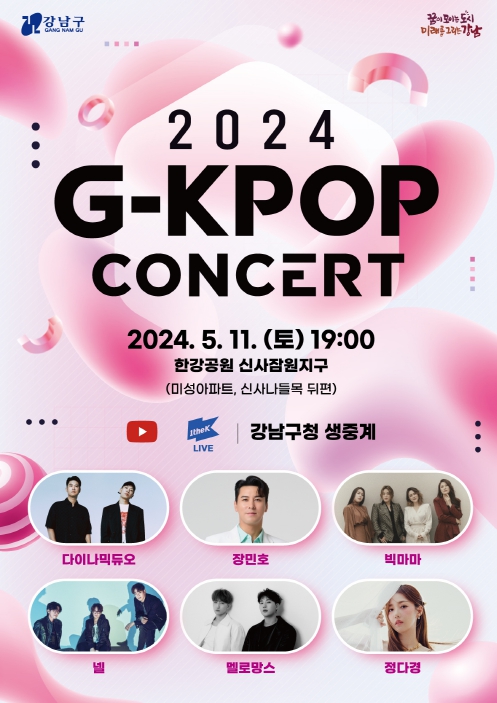 [뉴스서울] 꿈이 모이는 도시, 미래를 그리는 강남구가 5월 11일 저녁 7시에 한강공원 신사잠원지구(미성아파트, 신사나들목 뒤편) 다목적 운동장에서 G-KPOP 콘서트를 개최한다.