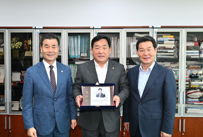 [뉴스서울] 전국원전인근지역 동맹 행정협의회(회장 김영길 울산 중구청장, 부회장 권익현 전북 부안군수)가 6월 26일 오후 4시 50분 국회를 방문해 박성민 국회의원에게 감사패를 전달했다.