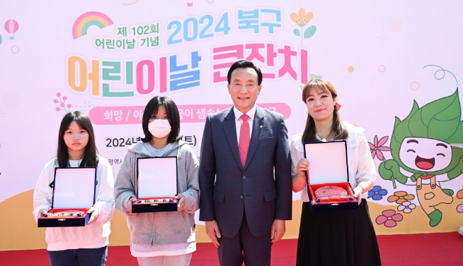 [뉴스서울] 박천동 북구청장이 4일 북구청 광장에서 열린 북구 어린이날 기념식에서 모범어린이 및 아동복지 유공자에게 표창패를 전달한 후 기념촬영을 하고 있다.