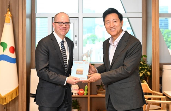 ▲ 오세훈 서울시장(사진 오른쪽)이 5월 27일(월) 오전 시청 집무실에서 제이슨 매서니 랜드연구소장(사진 왼쪽)과 면담하고 기념촬영하고 있다. |