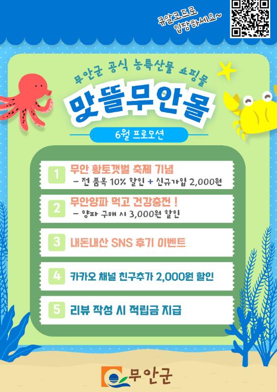 맛뜰무안몰 회원에게 전 상품 10% 할인쿠폰(6.9.부터 30.)을 지급하고 신규 회원에게는 2천 원 추가 쿠폰(6.1.부터 30.)을 지급한다.