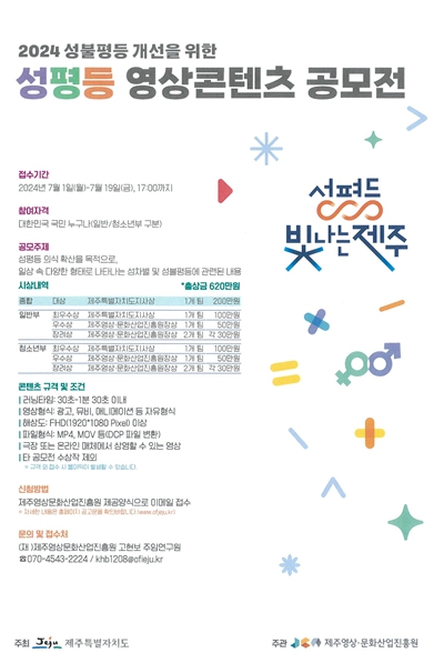 [뉴스서울] 제주특별자치도와 (재)제주영상·문화산업진흥원은 2024 성불평등 개선을 위한 성평등 영상콘텐츠 공모전을 개최한다.