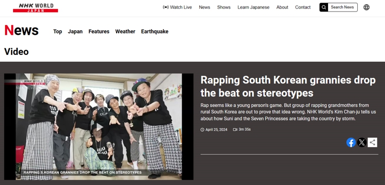 칠곡 할매힙합그룹 수니와 칠공주가 일본 NHK 방송을 타고 전 세계 140개국 안방 시청자 앞에서 랩을 선보이며‘K-할매’의 흥과 끼를 뽐냈다.