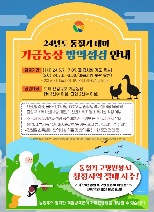 고병원성 조류인플루엔자 발생 위험시기인 동절기가 오기 전, 1단계 점검으로 5월 7일부터 7월 5일까지 2개월간 모든 전업규모 가금농장 320호(닭 3천수 이상, 그 외 2천수 이상)를 점검한다.
