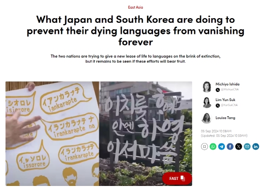 CNA는 지난 9월 5일 ‘일본과 한국이 소멸 위기 언어를 지키기 위해 하고 있는 일’이라는 제목의 기획 기사*를 통해 제주어 보전 현황과 과제를 심층적으로 다뤘다.