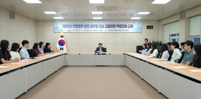 제주도는 29일 오전 제주농업기술원 농업디지털센터에서 제주도와 행정시 민원 담당 공무원 50여 명이 참석한 가운데 ‘2025년 고충민원 역량강화 교육’을 실시했다.