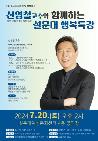 [뉴스서울] 제주특별자치도 설문대여성문화센터는 7월 20일 오후 2시 설문대여성문화센터 4층 공연장에서 강북삼성병원 정신건강의학과 신영철 교수를 초청해 ‘행복한 인생을 위한 정신과 의사의 조언’을 주제로 행복특강을 개최한다.