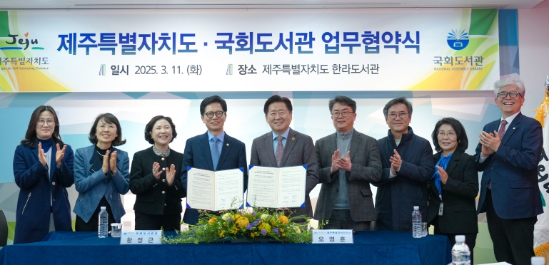 협약식에는 오영훈 제주도지사와 황정근 국회도서관장을 비롯해 양 기관 주요 관계자 10여 명이 참석했다.