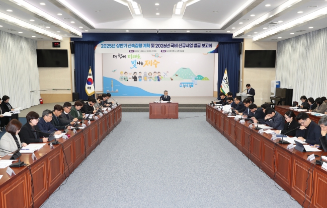 제주도는 22일 오전 제주도청 본관 4층 탐라홀에서 진명기 행정부지사 주재로 ‘2025년 상반기 신속집행 추진 점검 및 2026년 국비 신규사업 발굴 보고회’를 개최했다.
