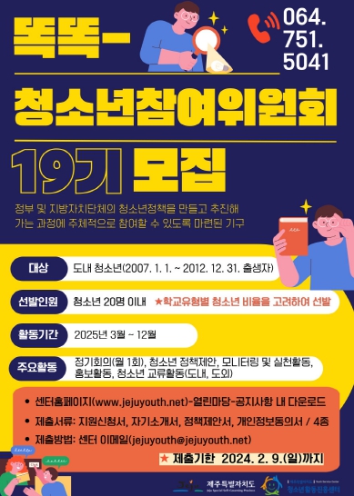 [뉴스서울] 제주특별자치도에서 위탁 운영하고 있는 제주특별자치도청소년활동진흥센터는 2025년 청소년의 참여로 변화하는 제주를 이끌어 갈 제19기 제주특별자치도 청소년참여위원회 신규 청소년 위원을 오는 2월 9일까지 모집한다.