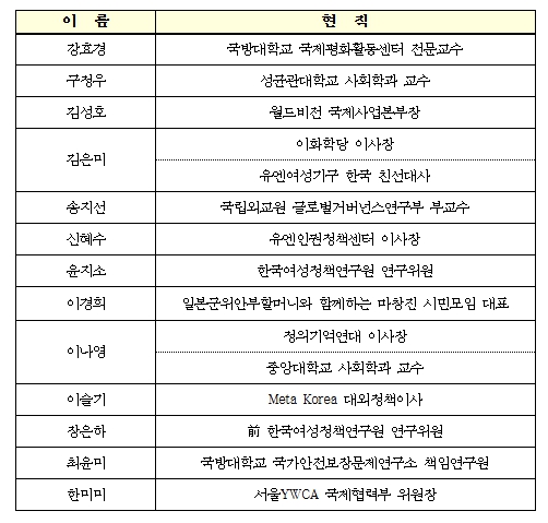 | ▲ 여성과 함께하는 평화 2기 자문위원 명단(가나다순) |