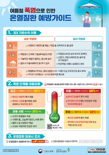 또한, “폭염과 집중호우가 본격적으로 발생하고 있어 각별한 주의가 필요한 상황”이라며, “「온열질환 예방가이드」, 「호우·태풍 대비 사업장 안전보건 가이드」를 참고하여 재해예방 조치를 철저히 이행해달라.”라고 강조했다.