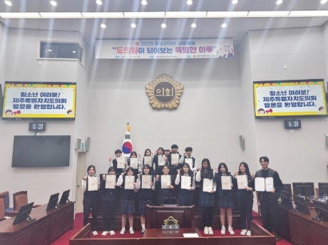 아울러, 도의원과의 만남에서 현길호 보건복지안전위원장은 학생들에게 “오늘 의정체험으로 민주적인 의사결정 과정을 배우는 것은 매우 뜻깊은 일이며, 앞으로 미래 제주를 이끌어나가는 데 소중한 밑거름이 되길 바란다”고 말했다.