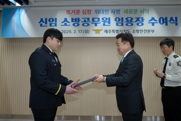오영훈 지사는 임용식에서 “신임 소방공무원들의 늠름한 모습은 도민들이 더 안전하고 건강하게 생활할 수 있는 튼튼한 토대가 될 것”이라며 “그 과정에서 소방공무원 여러분의 삶도 더욱 빛나길 바란다”고 격려했다.