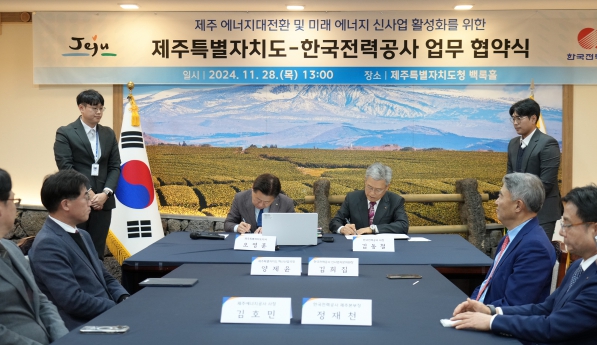 제주도는 28일 오후 도청에서 한국전력공사와 업무협약을 체결하고 재생에너지 출력제한 문제 해결부터 글로벌 에너지 신시장 진출까지 전방위적 협력을 추진하기로 뜻을 모았다.