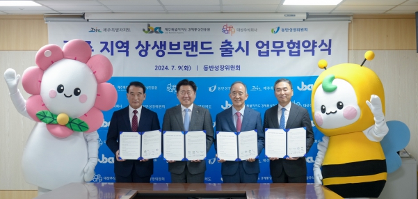 제주도는 9일 오후 3시 동반성장위원회 회의실에서 동반성장위원회(위원장 오영교), 대상㈜(대표이사 임정배), 제주경제통상진흥원(원장 오재윤)과 ‘제주 지역 상생브랜드 출시’를 위한 4자 업무협약을 체결했다.