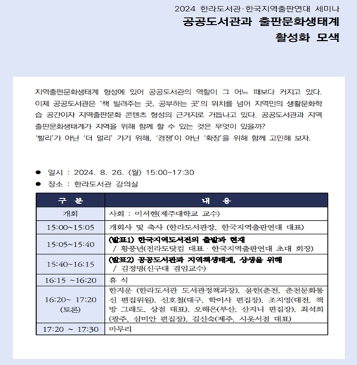 이번 세미나는 공공도서관이 단순한 책 대여소나 학습공간을 넘어 ‘지역민의 생활문화학습 공간’이자 ‘지역출판문화 콘텐츠의 근거지’로 거듭나는 현실에 주목했다. 전국의 청년 출판인과, 출판문화 연구자들과 한자리에 모여 공공도서관과 지역출판문화생태계의 지역 상생 방안을 논의할 예정이다.