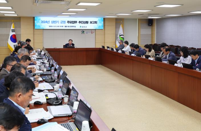 이번 보고회에서는 올해 상반기 군정 주요업무 결과에 대한 면밀한 점검 및 367개의 하반기 주요업무 계획의 적극적인 추진을 위해 마련되었으며,기획감사담당관을 시작으로 총 26개 부서의 △2024년도 상반기 주요 추진성과 및 문제점 분석 △2024년도 하반기 주요업무 추진계획 △공약사업 및 군수 지시사항 처리현황 보고가 있었다.