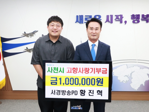 황PD는 7일 사천시청을 방문하여 사천발전을 위해 써달라며 고향사랑기부금 100만 원을 전달했다. 황PD는 벌리동 출신으로 사천에서 초·중·고를 졸업하고 현재 서경방송 문화사업팀 PD로 근무하고 있는 건실한 청년(35세)으로 특히 이번 기부는 황PD가 2년간 모아온 청년희망적금 만기로 받은 이자를 기부한 것으로 의미가 더욱 깊다.