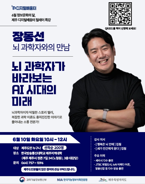 세계적 뇌과학자 장동선 박사를 초청한 이번 강연은 ‘뇌과학자가 바라보는 AI 시대의 미래: 디지털시대의 변화’를 주제로, 6월 10일 오전 10시 한국방송통신대학교 제주지역대학 3층 대강당에서 개최될 예정이다.