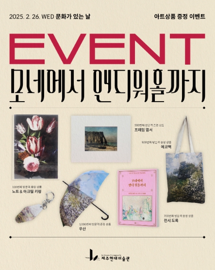 당일 미술관을 방문하는 관람객 중 100번째, 300번째, 500번째, 700번째, 1,000번째 입장객에게 《모네에서 앤디 워홀까지: 서양미술 400년, 명화로 읽다》 전(展)의 아트상품을 증정한다.