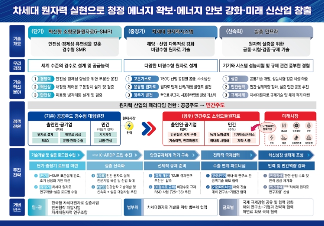 이에 과기정통부는 신속 시장 대응이 가능한 민간과 함께 기술개발을 넘어 실증까지 차세대 원자력 조기 실현을 위한 방안을 제시하여 ‘청정 에너지 확보, 에너지 안보 강화, 미래 신산업 창출’을 달성한다는 계획이다.