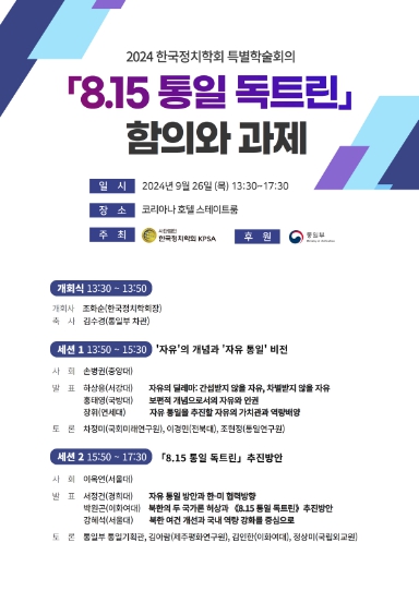 [뉴스서울] 통일부는 9월 26일 ‘「8.15 통일 독트린」 함의와 과제’를 주제로 개최되는 「한국정치학회 특별학술회의」를 후원하고, 개회식(13:30~50)에 김수경 통일부 차관이 참석하여 축사할 예정이라고 밝혔다.