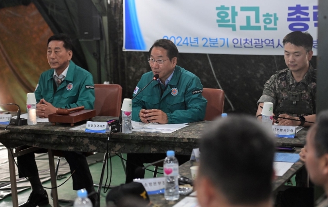 [뉴스서울] 인천광역시는 21일, 인천 장도훈련장에서 유정복 인천시장과 이광섭 17사단장을 비롯한 이봉락 인천시의회의장, 박재억 인천지방검사장, 김용진 중부지방해양경찰청장, 임원섭 인천소방본부장 등 300여 명이 참석한 가운데 ‘통합방위 실기동훈련과 연계한 2024년 2분기 인천시 통합방위협의회’를 실시했다.