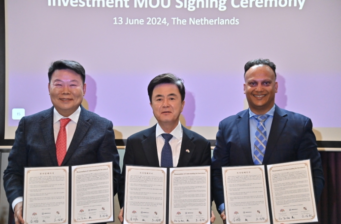 김 지사는 13일 네덜란드 노르트브라반트주 컨퍼런티에센트럼 호텔 보벤동크에서 애비 마하라지 뉴콜드 최고운영책임자, 오성환 당진시장과 투자양해각서를 체결했다.