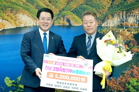 기탁식에는 김영록 전남도지사, 재경남호남향우회 이병철 회장과 최권식 김해향우회장, 김응상 창원향우회장 등 5명이 참석했다.