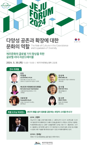 [뉴스서울] 제주특별자치도는 오는 30일 오후 3시 20분 제주국제컨벤션센터에서 열리는 제19회 평화와 번영을 위한 제주포럼에서 ‘다양성 공존과 확장에 대한 문화의 역할’을 주제로 세션을 운영한다.