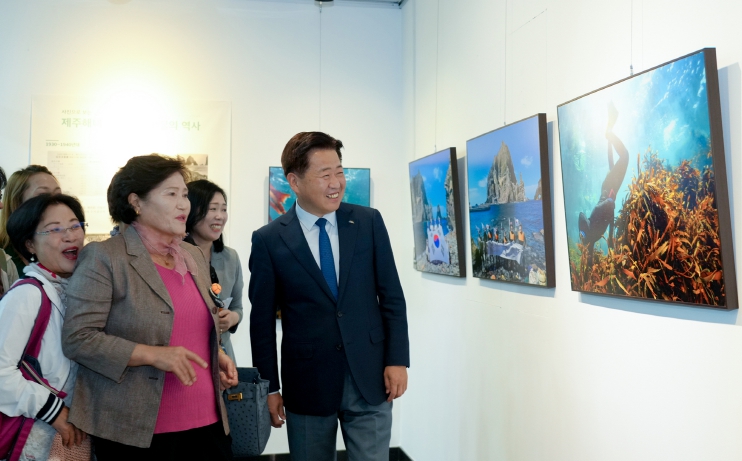 간담회 이후 오영훈 지사는 제주해녀들과 함께 도청 로비에서 진행 중인 독도 물질시연 행사 전시 ‘제주해녀, 독도를 지켜내다’를 함께 관람하며, 사명감을 갖고 독도 물질시연에 참여한 제주해녀에게 다시 한 번 고마움을 표했다.