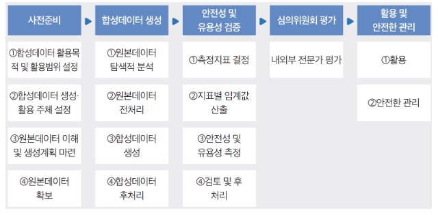 안내서는 각계 전문가가 참여한 연구반에서 안을 만들고, 이후 외부 전문가의 추가 의견수렴을 거쳐 완성되었다. 안내서에서는 개인정보 식별가능성에 실질적으로 대응할 수 있도록 합성데이터 생성·활용 단계를 ①사전준비→②합성데이터 생성→③안전성 및 유용성 검증→④심의위원회 평가→⑤활용 및 안전한 관리로 제시하였다. 아울러, 합성데이터 생성·활용 주체와 관련된 적법절차, 원본데이터의 전처리 방식, 안전성·유용성 검증방법과 지표 등 생성·활용 단계별 세부절차를 안내하였다. 또한, 생성과정 전반에 대한 체크리스트와 문서 예시를 함께 제시하여 담당자 등이 쉽게 이해할 수 있도록 하였다.