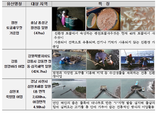 이번에 국가중요어업유산으로 지정된 제14호 ‘강릉창경바리어업’은 ‘창경(窓鏡)’이라는 도구를 이용해 수중에서 맑은 시야를 확보하여 해조류 및 저서생물 등을 채취하는 어업이다. 제15호 ‘광천토굴새우젓가공업’은 자체적으로 수분을 생성하는 풍화암 재질로 이루어진 친환경 토굴에서 새우젓을 숙성・발효시키는 가공업이다. 제16호 ‘삼천포죽방렴어업’은 연안의 좁은 물목에 대나무로 만든 ‘V’자형 발을 설치해 물살의 힘에 실려 오는 물고기를 통 안에 가두어 잡는 전통적인 어업방식이다.