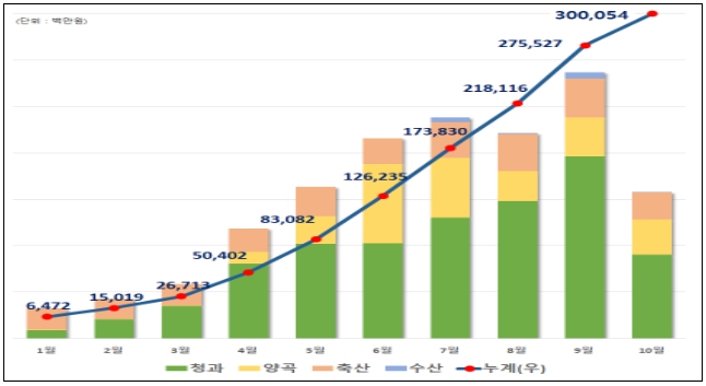 [뉴스서울] 농림축산식품부는 지난해 11월 30일 공식 출범한 농수산물 온라인도매시장의 올해 거래금액이 지난 10월 15일 3천억원을 돌파했다고 밝혔다. 온라인도매시장 거래금액은 6월 17일 1천억원, 8월 20일 2천억원을 달성하며 월 평균 30% 이상 성장하고 있다.