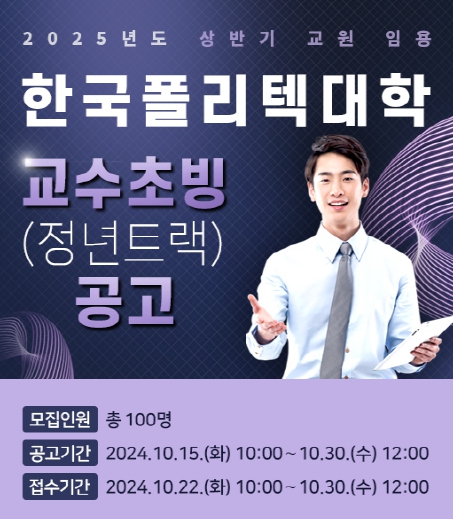 [뉴스서울] 한국폴리텍대학(이사장 이철수, 이하 ‘폴리텍대학’)이 대규모 교수 초빙에 나선다. 폴리텍대학은 ‘2025년도 상반기 임용 교수 초빙’을 통해 16개 계열에서 교원 100명을 채용한다고 20일 밝혔다. 원서접수는 오는 22일부터 30일 정오(12시)까지다.