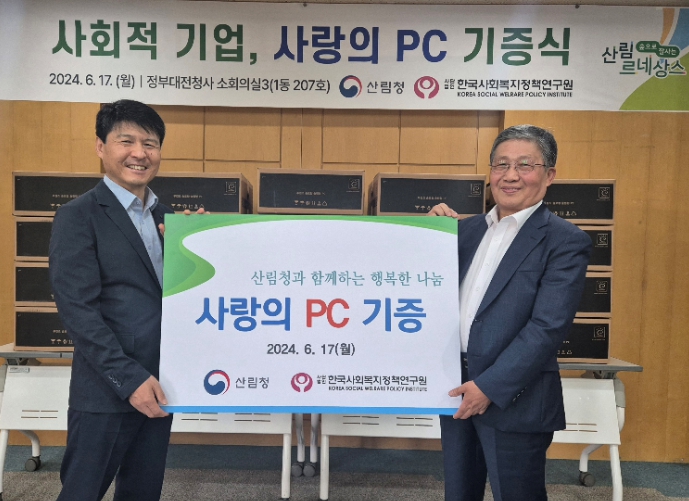 [뉴스서울] 산림청은 정부대전청사에서 컴퓨터를 비롯해 총 239대의 전산기기를 사회적기업인 (사)한국사회복지정책연구원에 무상으로 기증하는 ‘사랑의 컴퓨터 기증행사’를 가졌다고 17일 밝혔다.