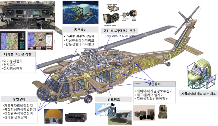 UH/HH-60 성능개량사업은 총 9,943억원을 투자하여 기존 헬기의 아날로그 조종실을 전자지도, 다기능시현기 등이 장비된 디지털 조종실로 개량하고 새로운 생존 및 항법/통신장비 등을 탑재하는 사업으로, 2029년부터 성능개량된 헬기가 실전배치될 예정이다.